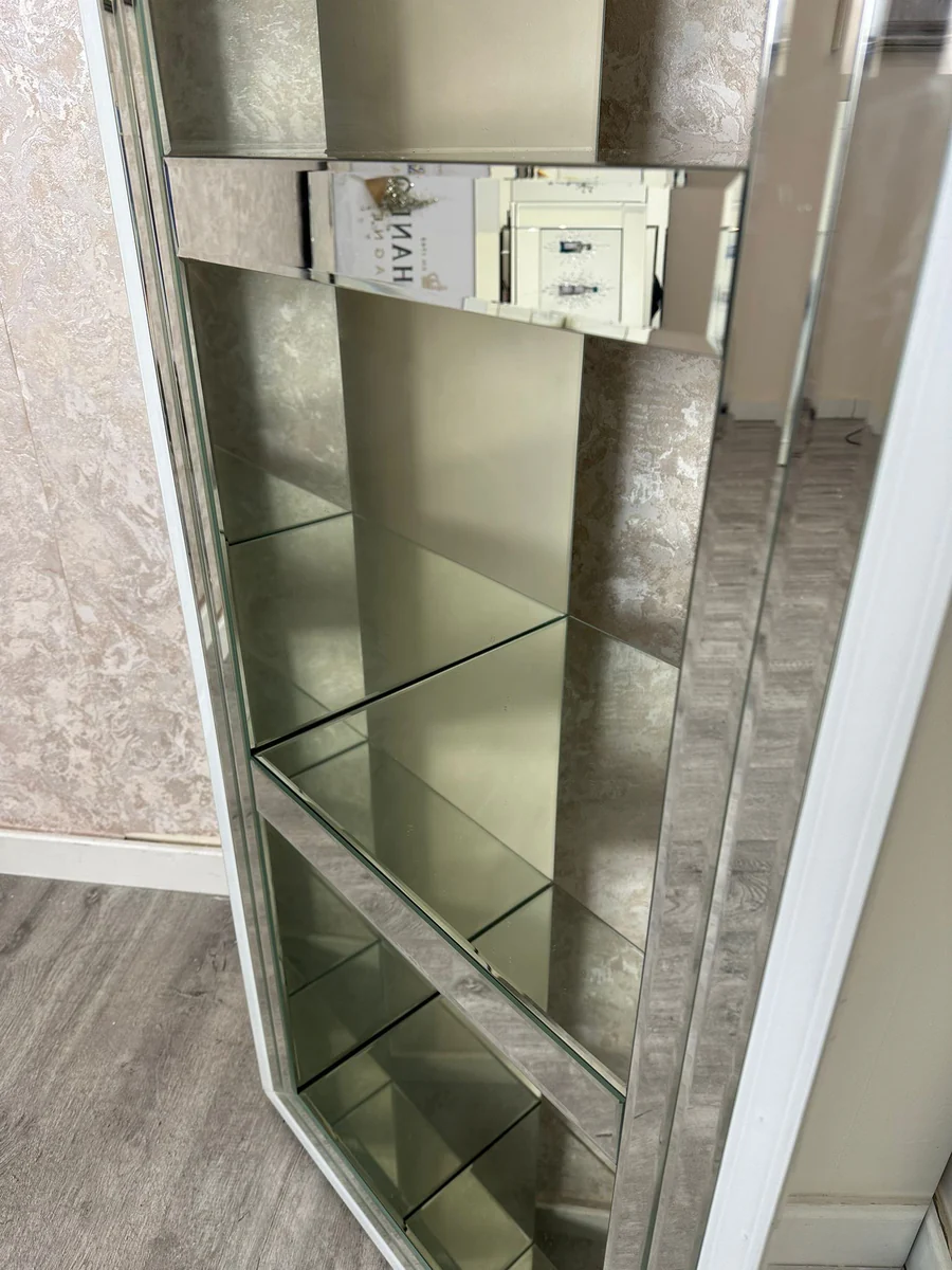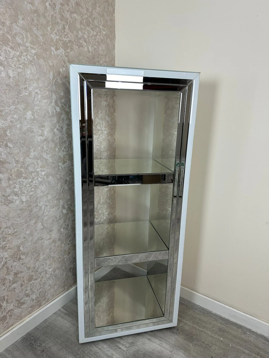 This sylish and sleek, smart storage unit is framed with white glass to give a give a classic effect. Mirrored throughout, this three-tiered shelf is a real show stopper.