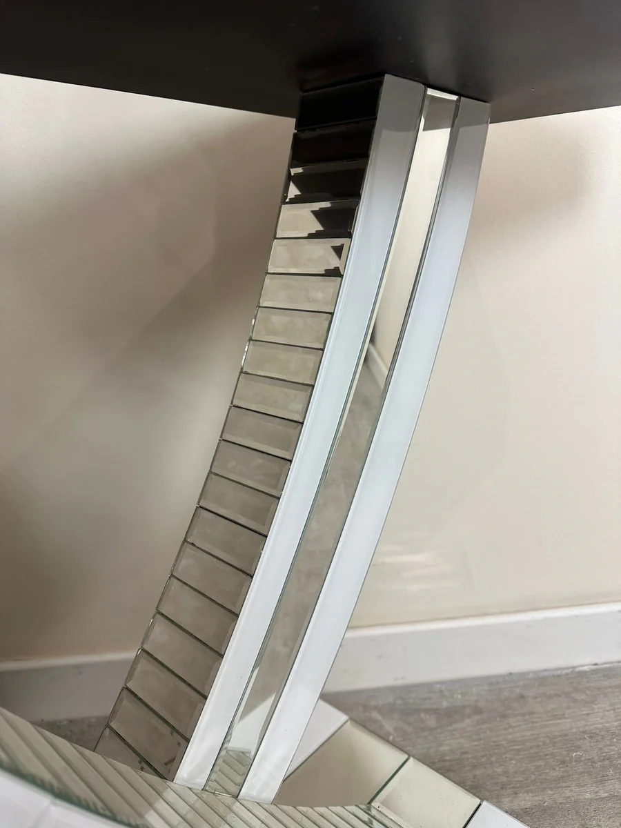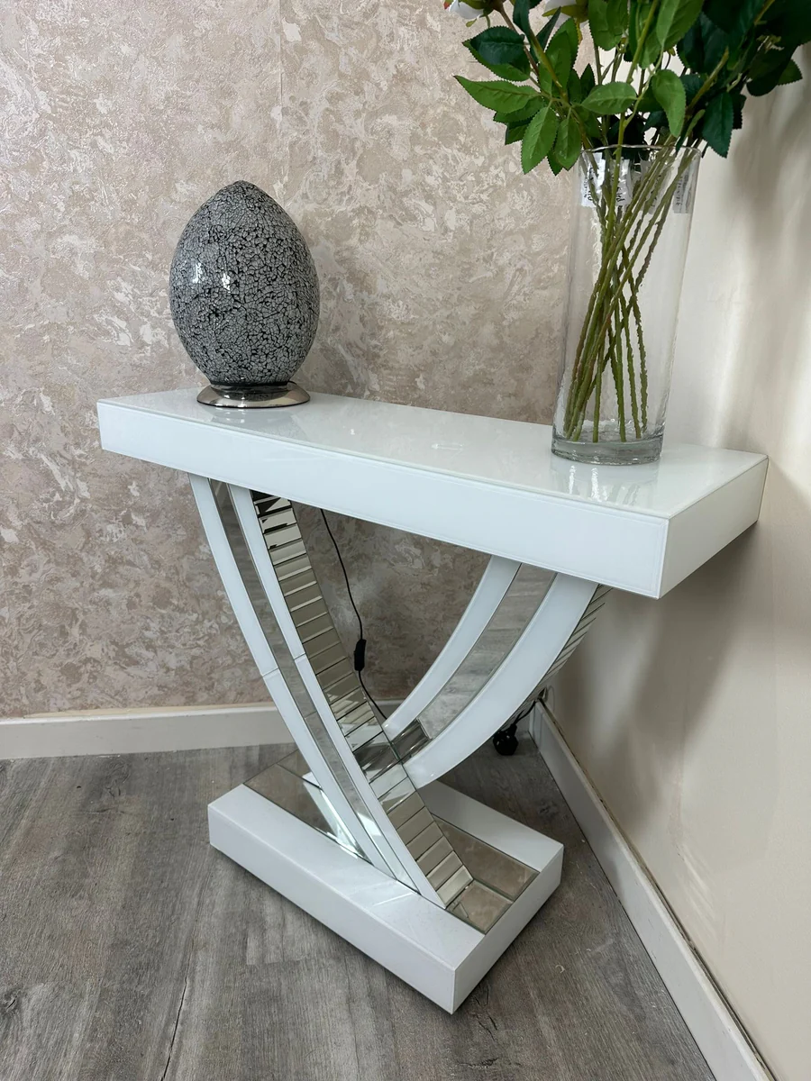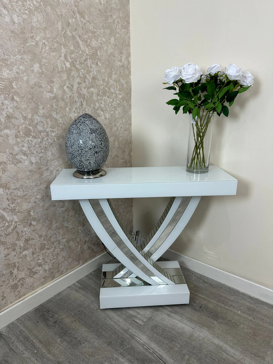 Stylish and sleek, this console has a simple and clean design that makes it easy to match to your present and future decor! Glossy white glass top that features silver mirror double strip. It’s minimal design will lift any room.