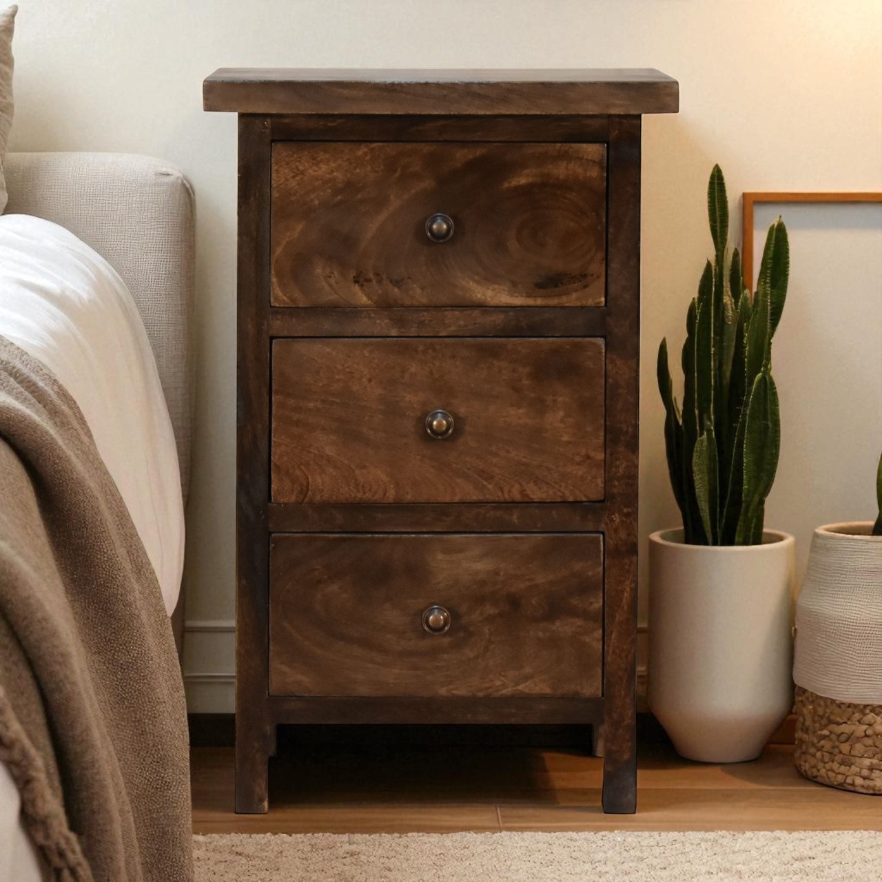 Standing by your bed, this MINI bedside gives you easy and convenient storage books, a glass of water or a phone. This three-drawer bedside will add warmth and character to your space. Beautifully made from 100% solid mango wood with a fine classic grey finish; its clean and elegant lines give a timeless appearance. Other features include 3 drawers, straight farm house feet and shiny round knobs. This petite product is a part of Recession Collection.