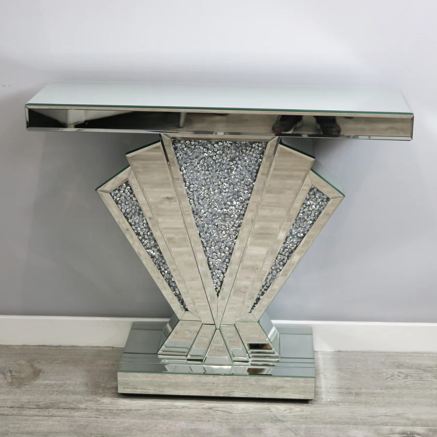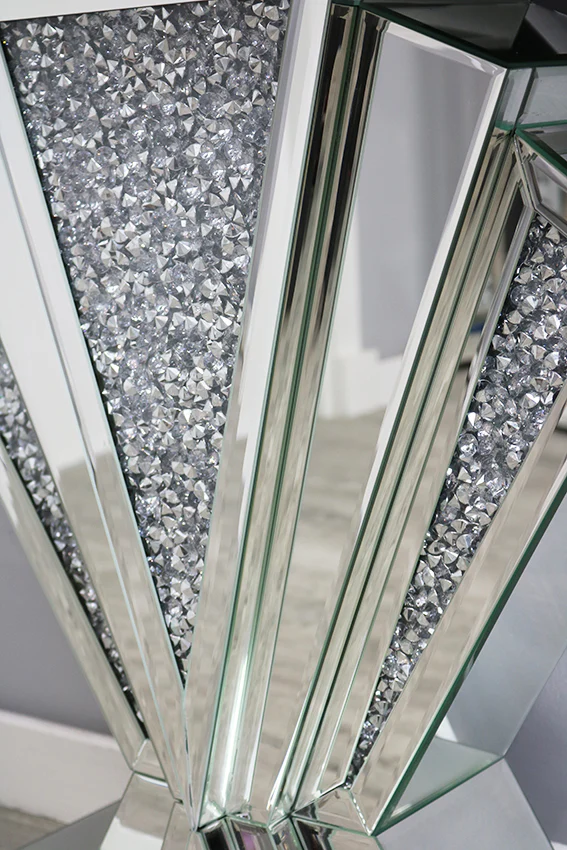 Small Mocka Fan Console Table. Bold and stylish this console will make a big impression on your room from it’s stylish shape to its luxurious sparkle. Features plain mirror top and silver mocka encased in glass.